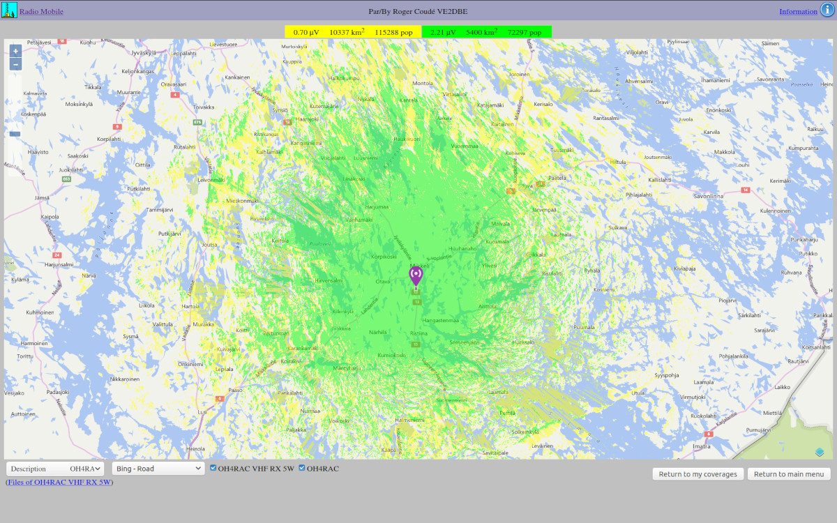 OH4RAC VHF-toistimen kuuluvuuskartat